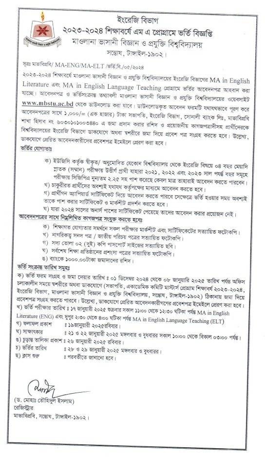 MA in English Literature & MA in English Language Teaching | Mawlana Bhashani Science & Technology University