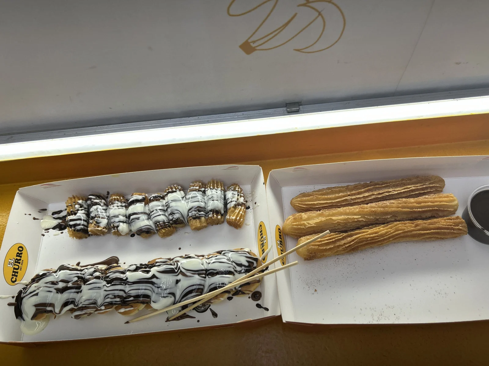 From the moment you step in, it feels like a warm hug on a winter night. Every little detail is whimsical—the stools and benches are shaped like mini churros, and the air smells of cinnamon sugar.