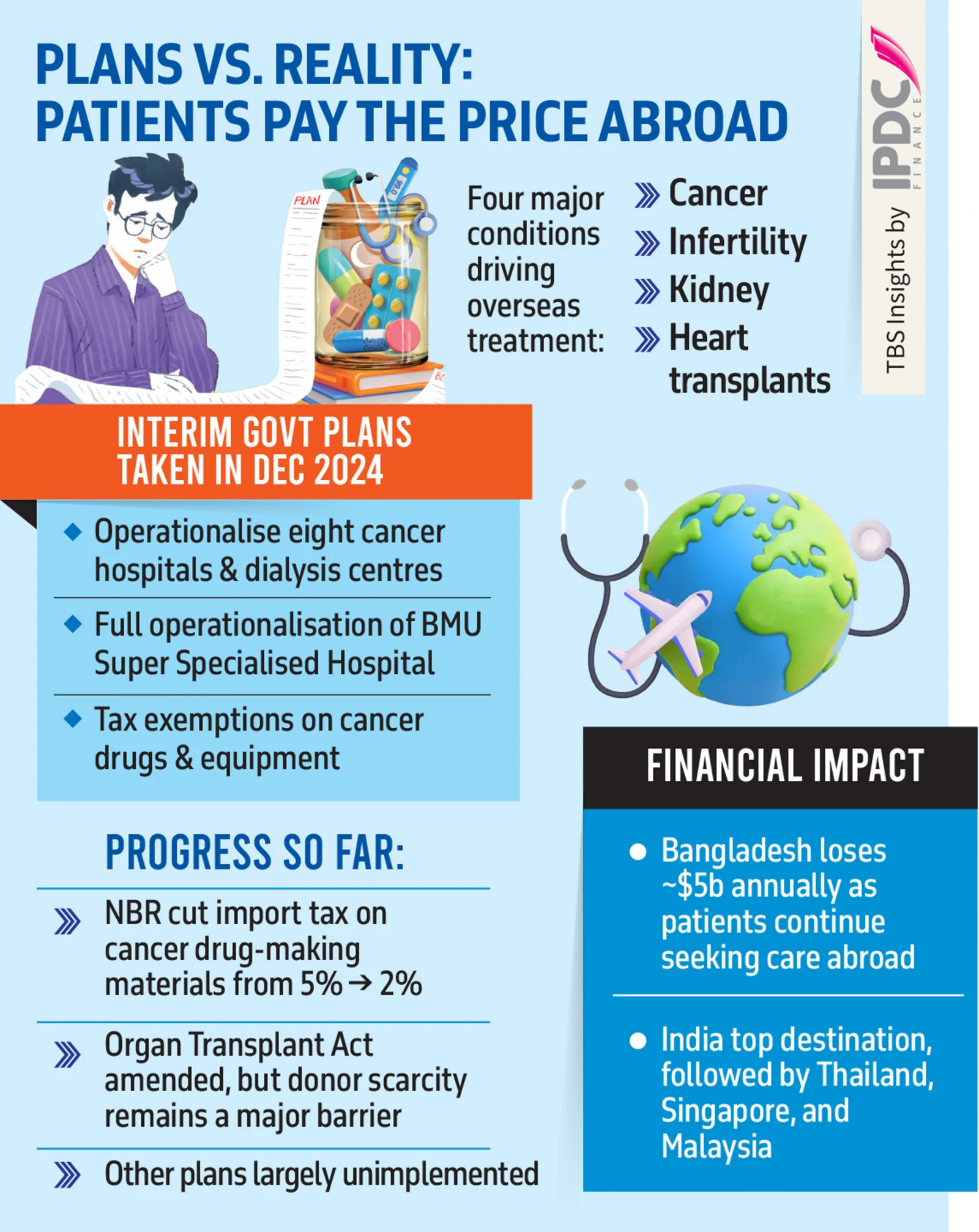 Sayed Abdul Hamid, a professor of Health Economics at the University of Dhaka, told TBS, “Bangladesh needs disease-specific plans backed by proper implementation to curb overseas treatment for cancer, kidney transplants and infertility. Without effective execution, patients will not benefit, and the large outflow of funds abroad will continue.”