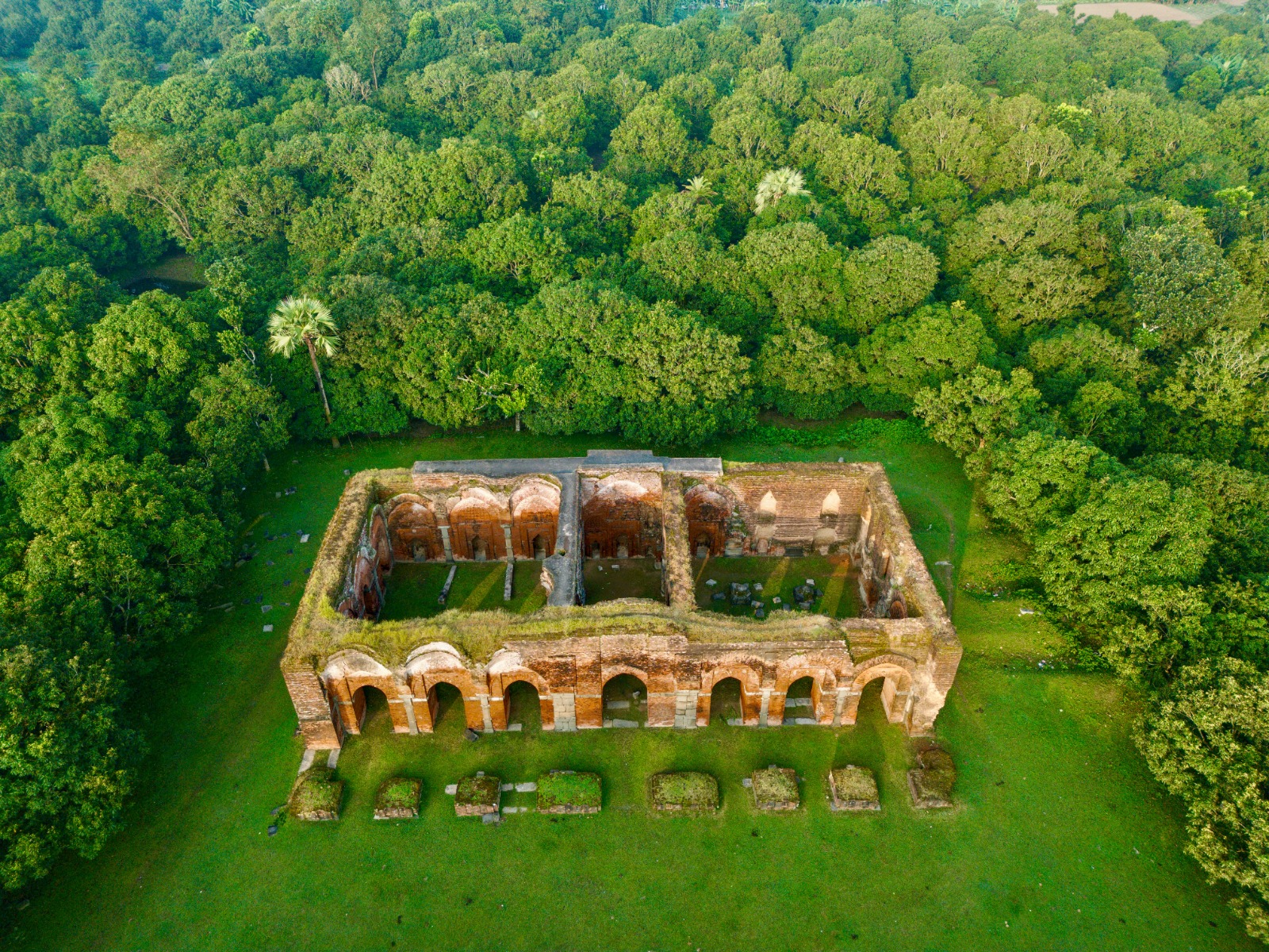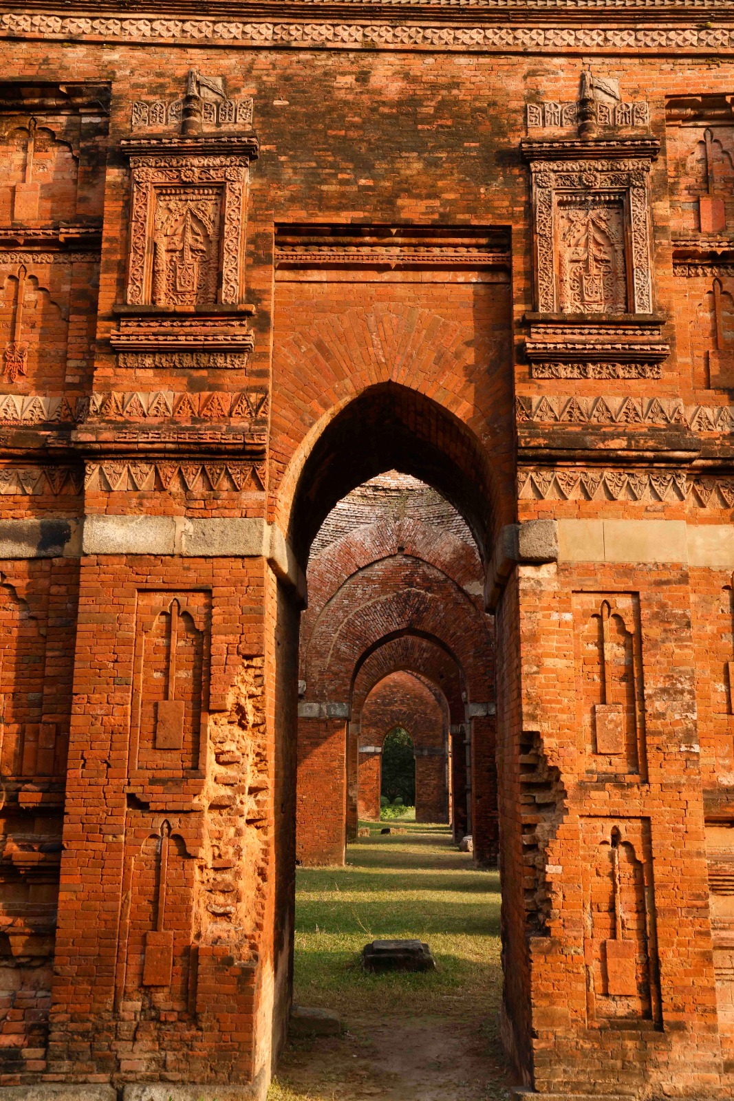 Gazing upon this exquisite terracotta artistry, one can almost feel the presence of the skilled hands that shaped the clay over five centuries ago. Each intricate pattern and flower etched into the brick is a whispered promise of eternity, a beautiful echo from the golden age of Bengal’s Sultanate. Photo Credit: Syed Zakir HossainRising from the verdant landscape of Bangladesh, the magnificent ruin of the mosque sits in profound stillness, a gentle giant surrendering its stone to the embrace of the wild. From this elevated perspective, the immense scale of the original complex is revealed. Photo Credit: Syed Zakir HossainThe majestic arches and columns stand resolute against the sky, their weathered, earthy brickwork bearing the noble scars of half a millennium. This facade, once pristine, now offers a melancholic beauty, its imposing silhouette a powerful metaphor for endurance. Photo Credit: Syed Zakir HossainStep further within, and the structure’s inner life unfolds in a stunning play of depth and rhythm. The line of successive arches pulls the eye onward, creating a vista that is both elegant and hauntingly empty. Photo Credit: Syed Zakir HossainInside the main sanctuary, the remaining vaults soar above, casting vast shadows that hint at the immense volume of the former prayer hall. Even in ruin, the architectural grace of the interior remains undeniable, its spatial arrangement designed to inspire contemplation and spiritual focus. Photo Credit: Syed Zakir HossainHere, captured in a final, intimate detail, is the enduring soul of the architecture: a weathered piece of terracotta ornament. It is a small but powerful relic of the glorious Sultanate era, a final, poetic signature of the artists and patrons who envisioned this great place. Photo Credit: Syed Zakir Hossain