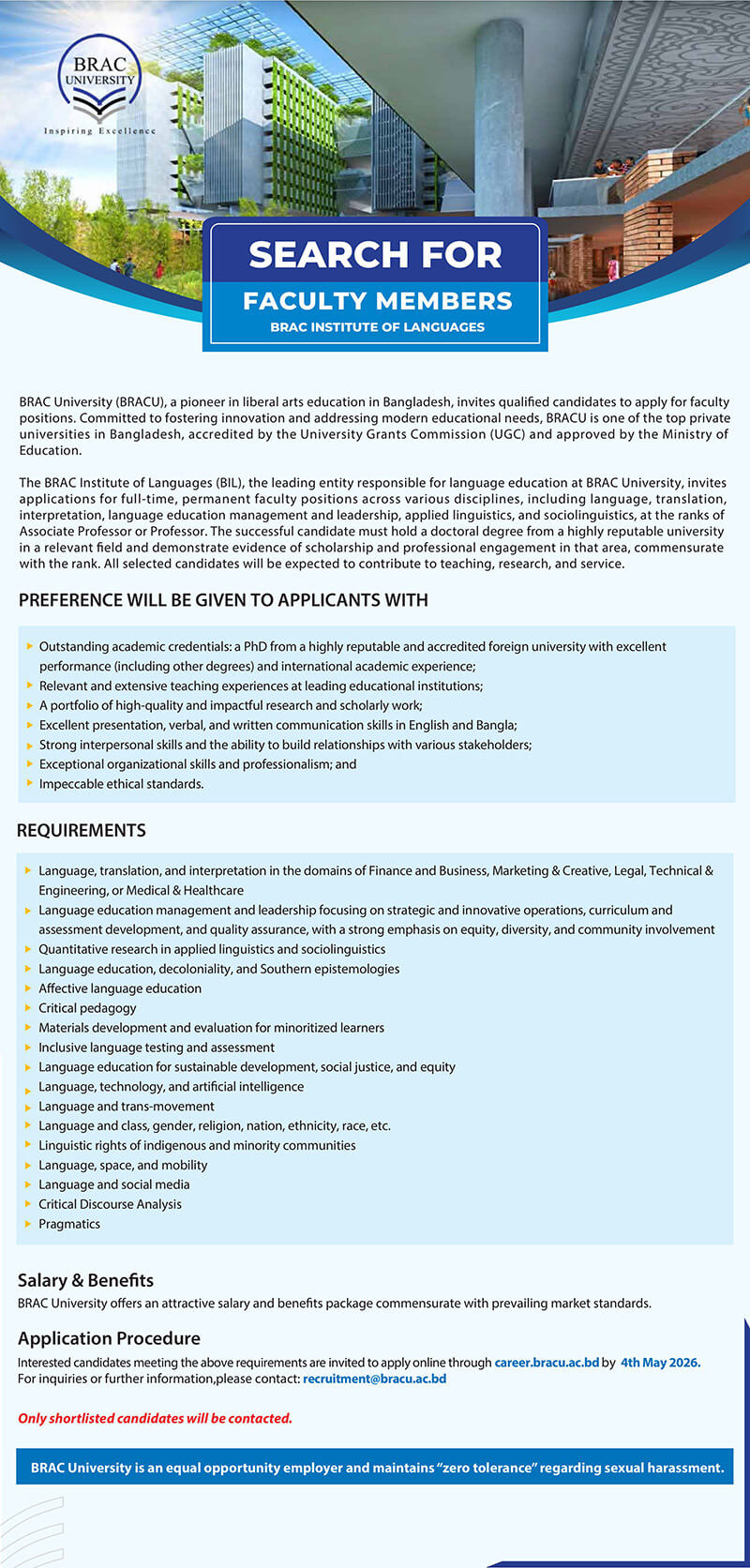 The BRAC Institute of Languages (BIL), the leading entity responsible for language education at BRAC University, invites applications for full-time, permanent faculty positions across various disciplines, including language, translation, interpretation, language education management and leadership, applied linguistics, and sociolinguistics, at the ranks of Associate Professor or Professor. The successful candidate must hold a doctoral degree from a highly reputable university in a relevant field and demonstrate evidence of scholarship and professional engagement in that area, commensurate with the rank. All selected candidates will be expected to contribute to teaching, research, and service.