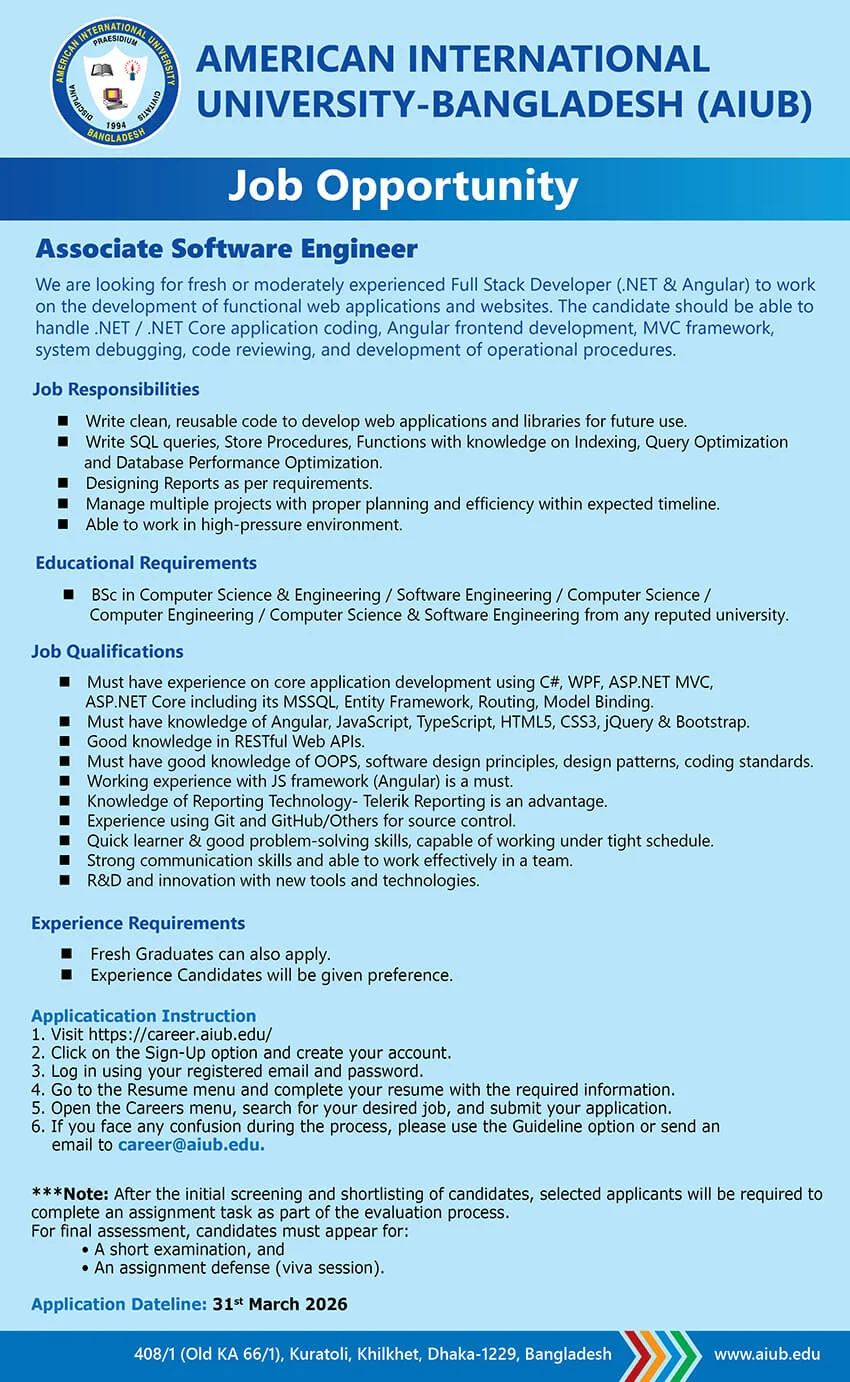 AIUB are looking for fresh or moderately experienced Full Stack Developer (.NET & Angular) to work on the development of functional web applications and websites. The candidate should be able to handle .NET / .NET Core application coding, Angular frontend development, MVC framework, system debugging, code reviewing, and development of operational procedures.