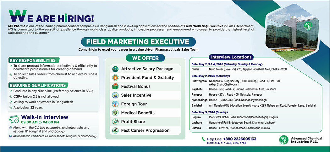 ACI Pharma is one of the leading pharmaceutical companies in Bangladesh and is inviting applications for the position of Field Marketing Executive in Sales Department. ACI is committed to the pursuit of excellence through world class quality products, innovative processes, and empowered employees to provide the highest level of satisfaction to the customer.