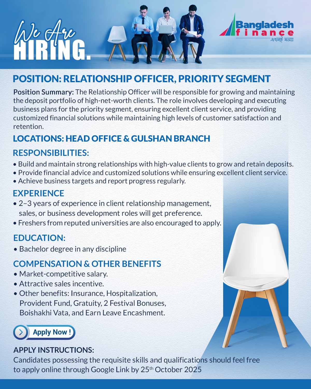 The Relationship Officer will be responsible for growing and maintaining the deposit portfolio of high-net-worth clients. The role involves developing and executing business plans for the priority segment, ensuring excellent client service, and providing customised financial solutions while maintaining high levels of customer satisfaction and retention.