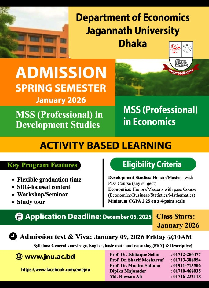 The Department of Economics at Jagannath University has announced admission for its Spring Semester (January 2026) professional Master’s programmes: MSS (Professional) in Development Studies and MSS (Professional) in Economics.