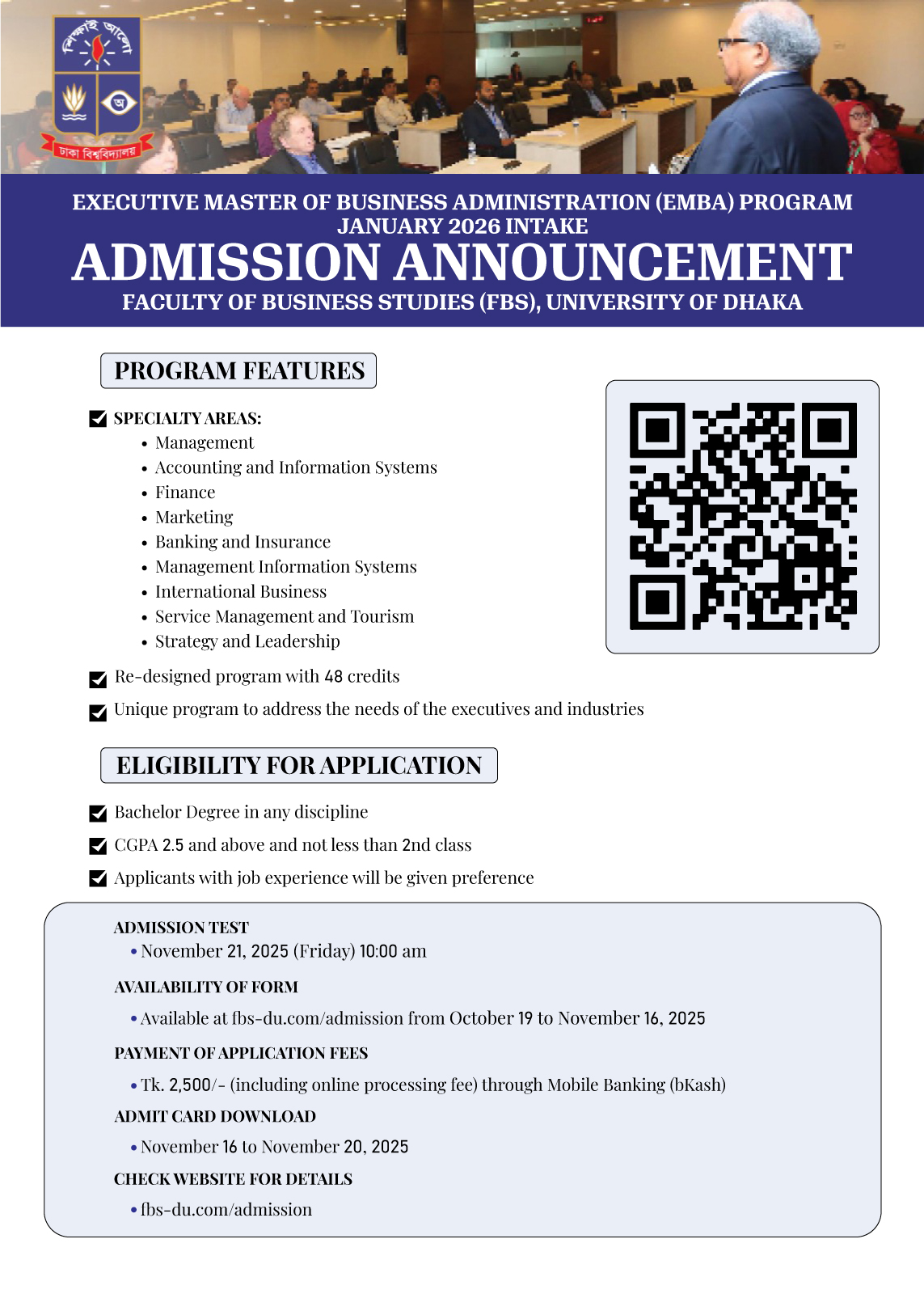 The Faculty of Business Studies (FBS) at the University of Dhaka has announced admission for its Executive Master of Business Administration (EMBA) Programme for the January 2026 intake.