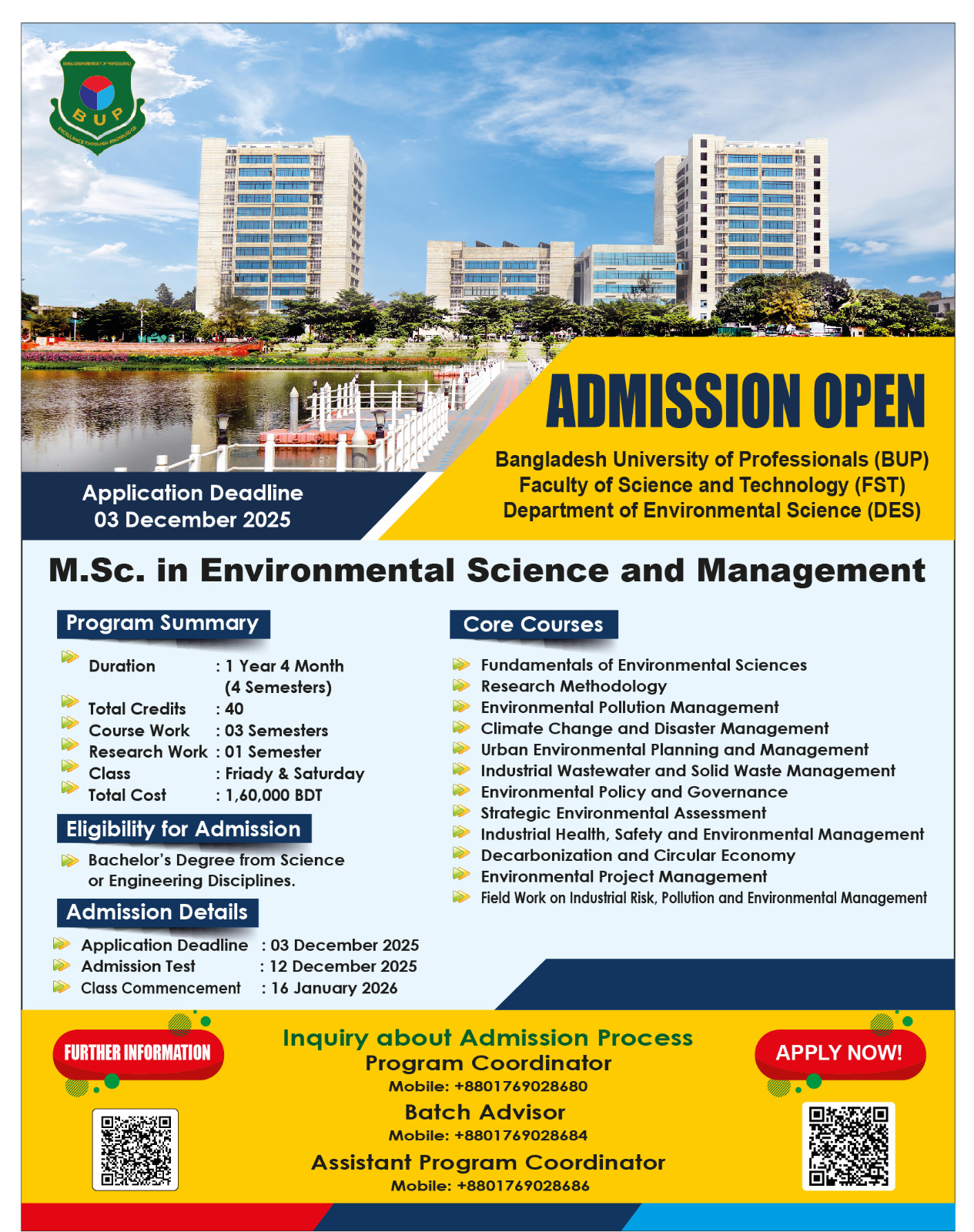 The Bangladesh University of Professionals (BUP), Faculty of Science and Technology (FST), Department of Environmental Science (DES), has invited applications for the M.Sc. in Environmental Science and Management Programme.
