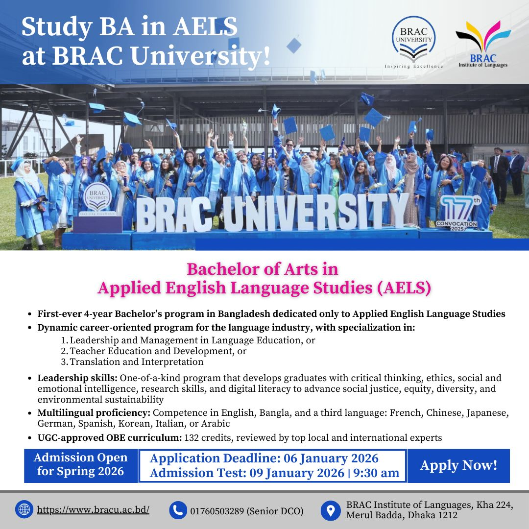 BRAC University, through the BRAC Institute of Languages, has announced admissions for its Bachelor of Arts in Applied English Language Studies (AELS) for the Spring 2026 session. This is the first-ever 4-year Bachelor’s programme in Bangladesh dedicated exclusively to this field. The dynamic, career-oriented curriculum is designed for the language industry and offers specialisations in Leadership and Management in Language Education, Teacher Education and Development, or Translation and Interpretation.
