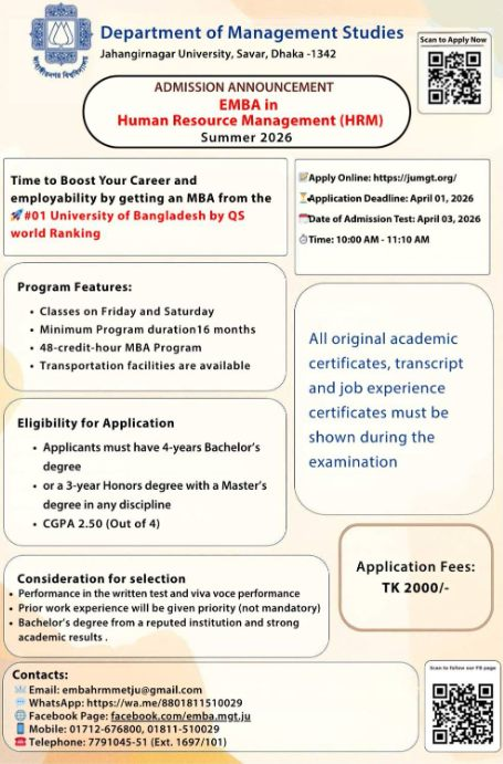 The Department of Management Studies at Jahangirnagar University, Savar, Dhaka, has announced admissions for its Executive MBA (EMBA) in Human Resource Management for the Summer 2026 session.