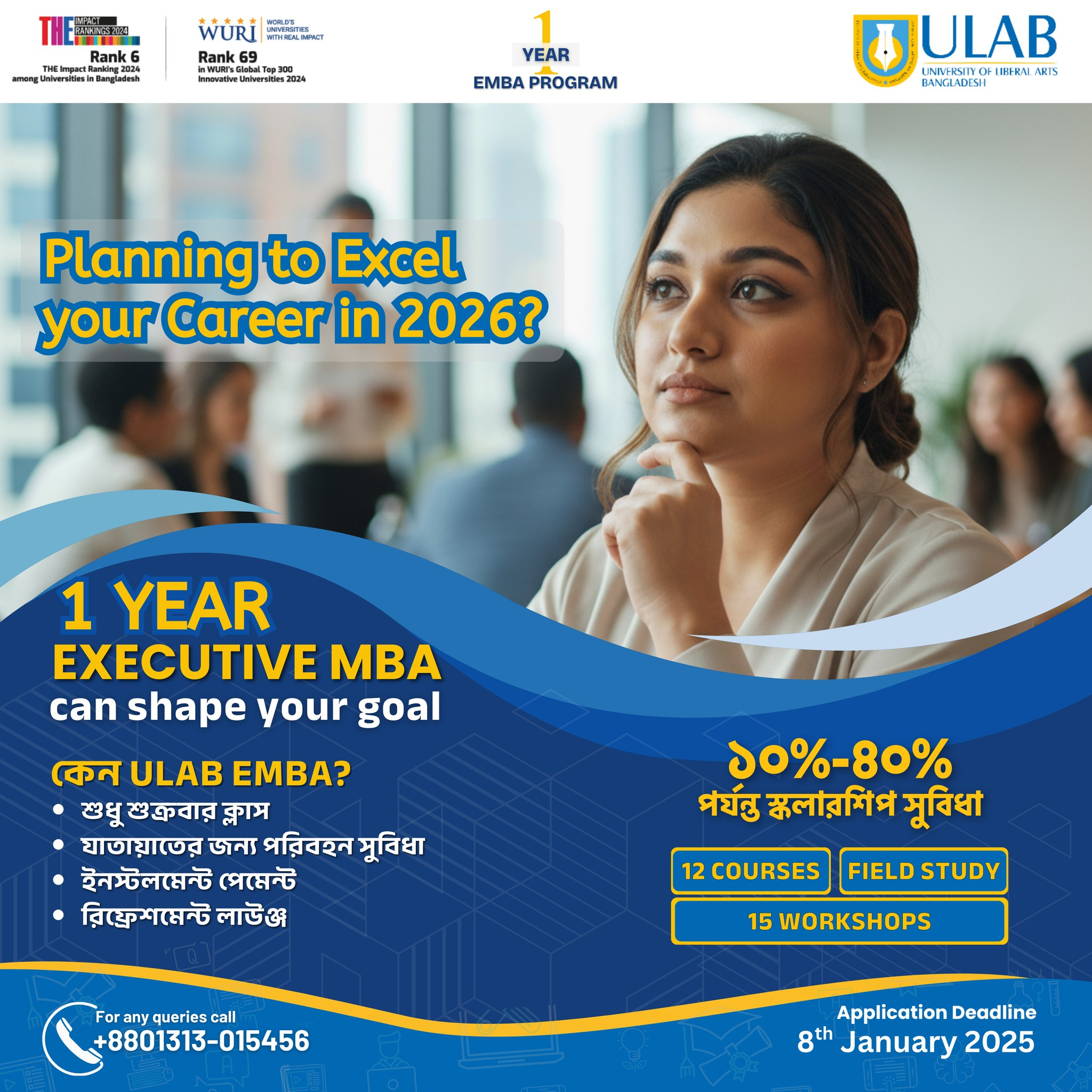The University of Liberal Arts Bangladesh (ULAB) is offering a 1-year Executive MBA (EMBA) programme designed to help professionals shape their career goals for 2026. The programme is structured to accommodate working individuals through a condensed timeline and specific student support features.