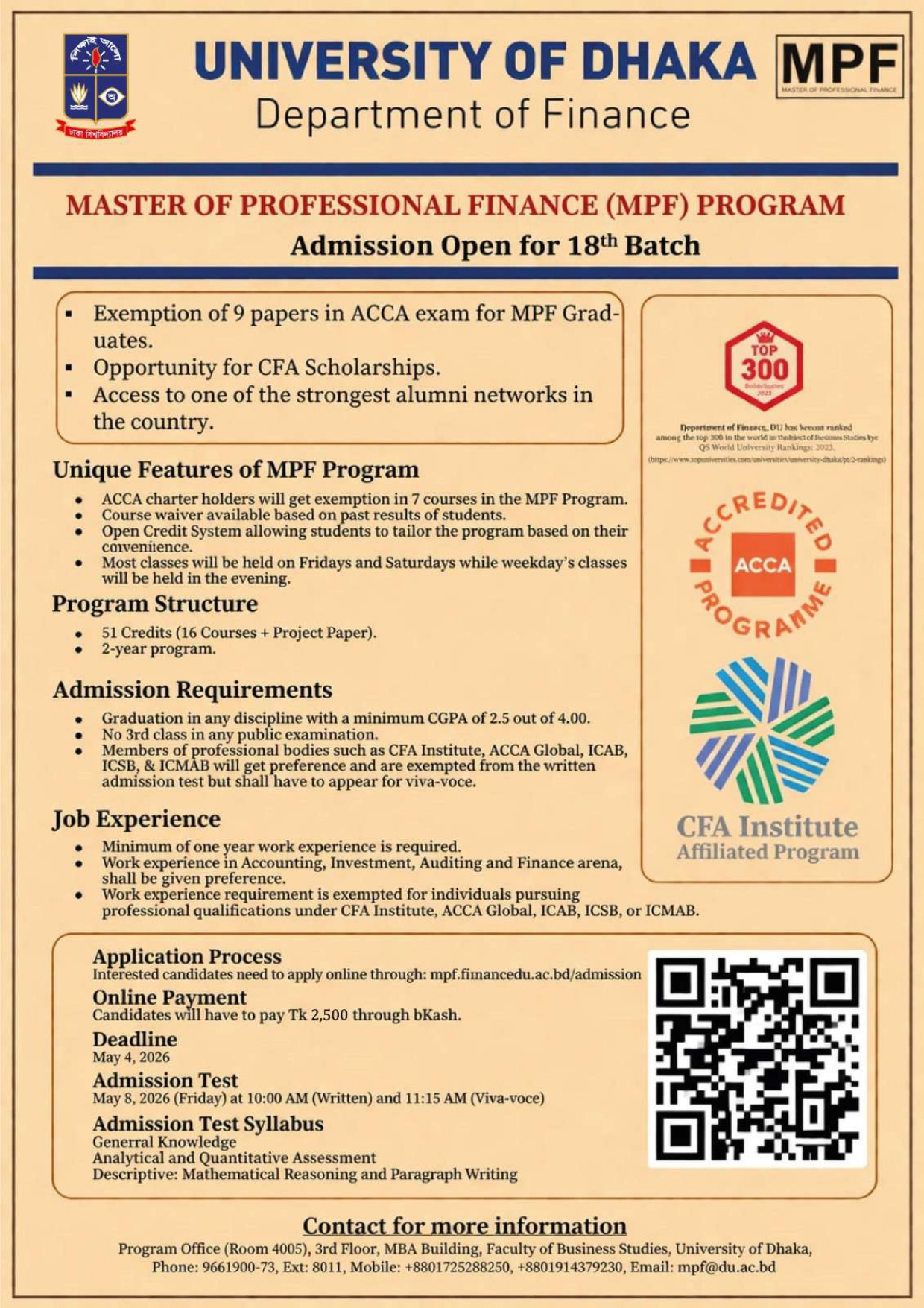 The Department of Finance at the University of Dhaka is currently accepting applications for the 18th batch of its Master of Professional Finance (MPF) programme.