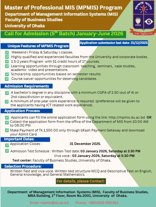 The Department of Management Information Systems (MIS), under the Faculty of Business Studies at the University of Dhaka, has announced a call for admission for the 5th batch of the Master of Professional MIS (MPMIS) programme. This professional course is scheduled for the January–June 2026 session and is designed to accommodate working professionals through a flexible academic structure.
