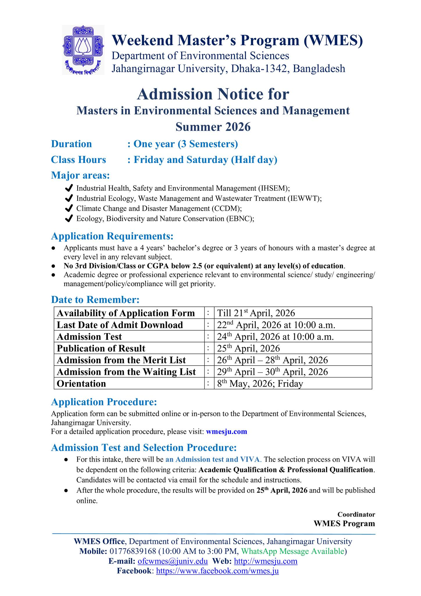 The Department of Environmental Sciences at Jahangirnagar University has announced the admission notice for its Weekend Master’s Programme (WMES) for the Summer 2026 session.