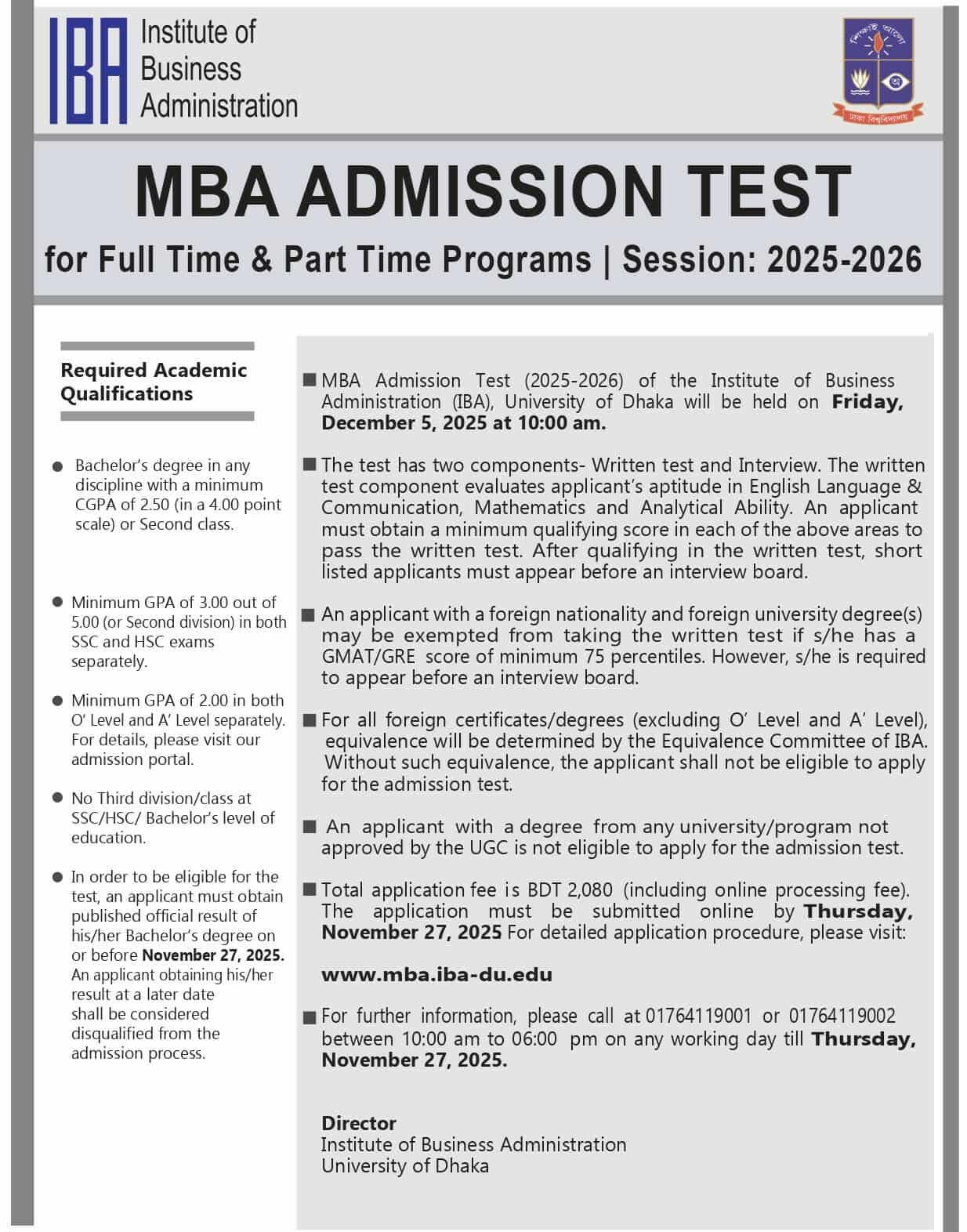 • Admission Test Date: The MBA Admission Test (2025-2026) will be held on Friday, 5 December, 2025, at 10:00 am.