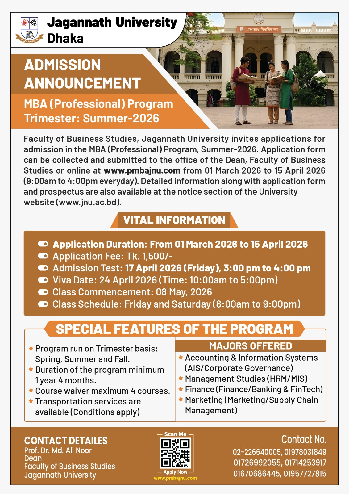 The Faculty of Business Studies at Jagannath University is currently inviting applications for its MBA (Professional) Programme for the Summer 2026 trimester.