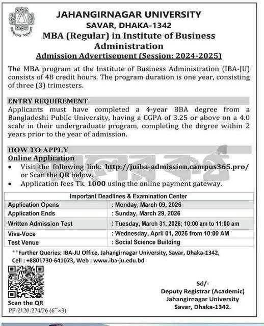The Institute of Business Administration at Jahangirnagar University, Savar, Dhaka, invites applications for its one-year (three trimesters) MBA (Regular) programme, which consists of 48 credit hours.