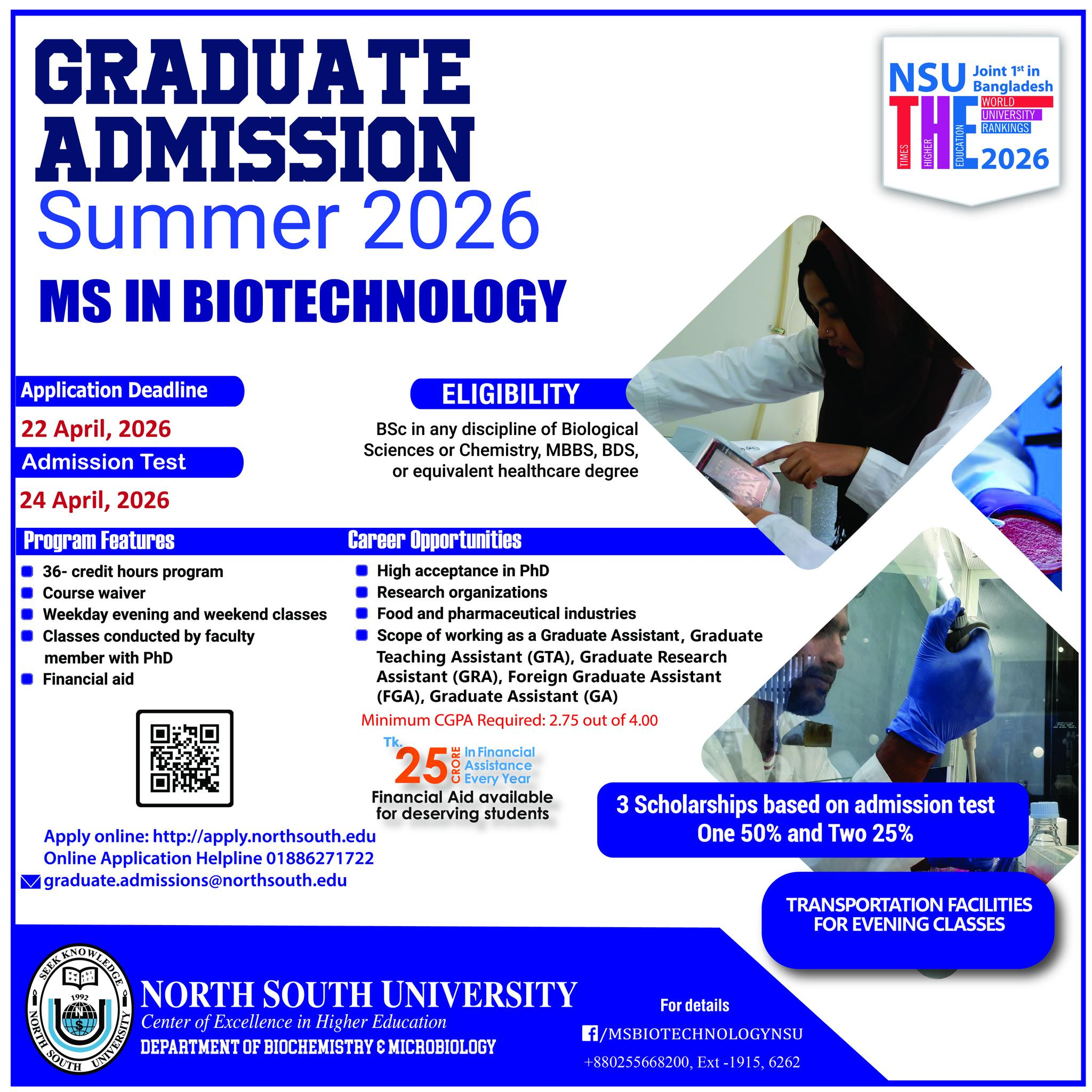 The Department of Biochemistry & Microbiology at North South University is currently inviting applications for its MS in Biotechnology programme for the Summer 2026 session.