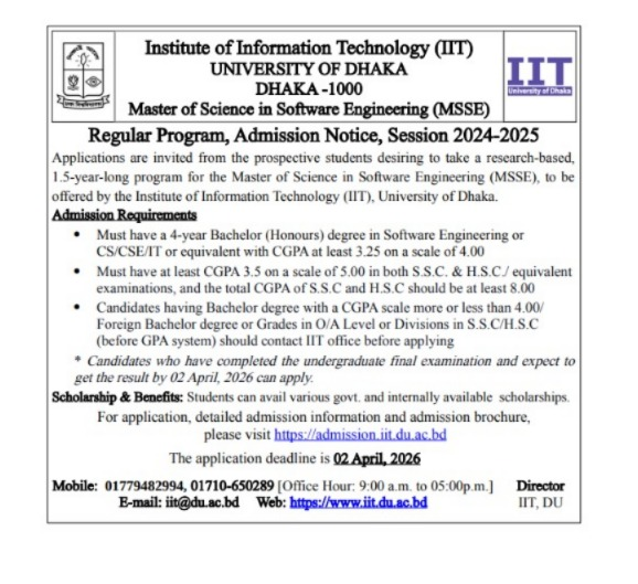 Applications are invited from the prospective students desiring to take a research-based, 1.5-year-long programme for the Master of Science in Software Engineering (MSSE), to be offered by the Institute of Information Technology (IIT), University of Dhaka.