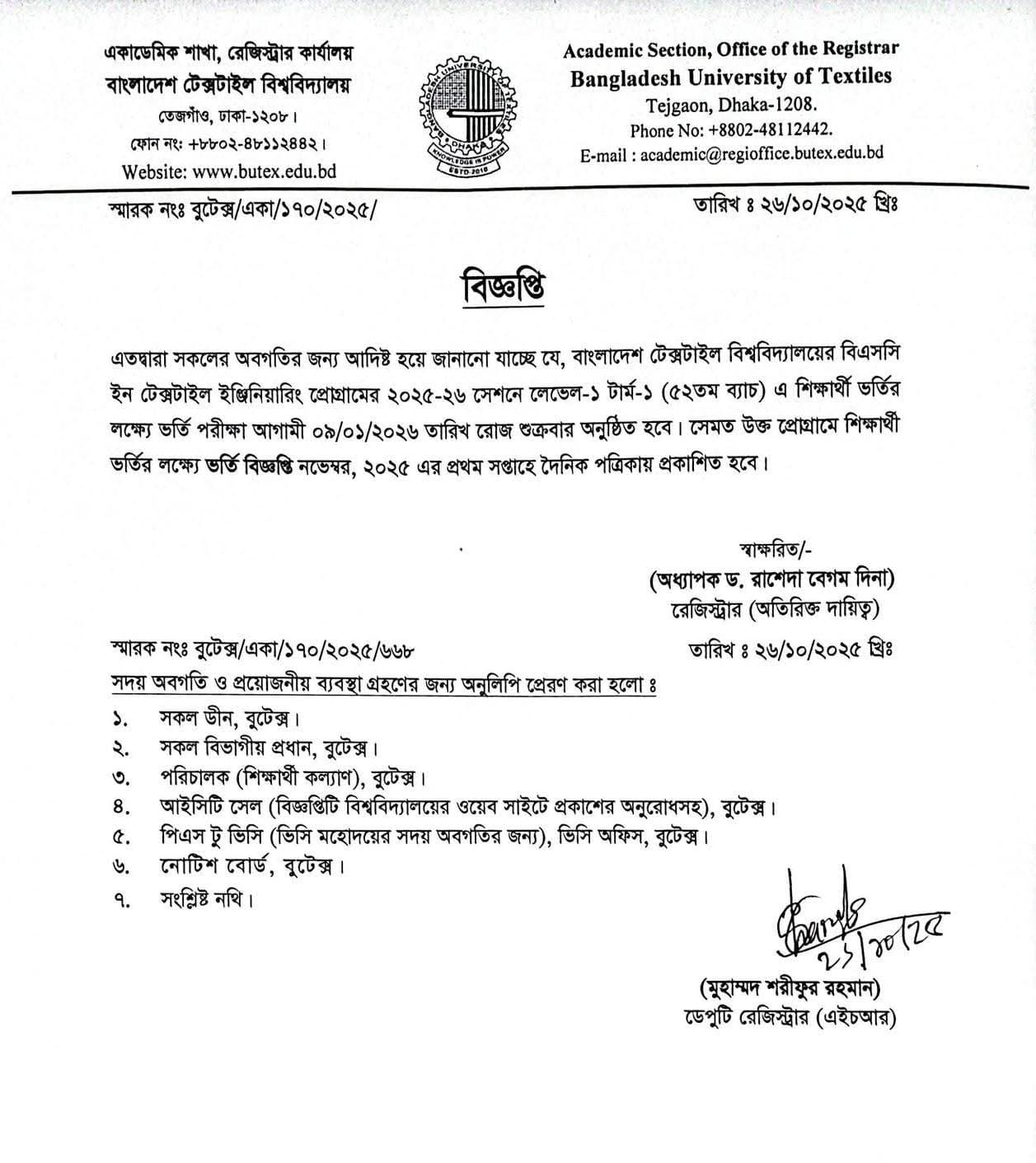 The Academic Section of the Registrar’s Office at the Bangladesh University of Textiles (BUTEX) has issued an emergency notice regarding the admission test for the B.Sc. in Textile Engineering program for the 2025-2026 session (Level-1, Term-1, 52nd Batch).