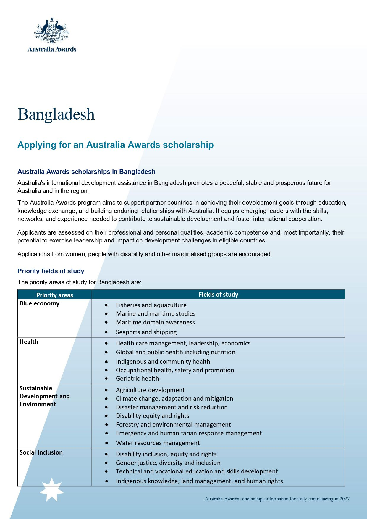 Australia’s international development assistance in Bangladesh promotes a peaceful, stable and prosperous future for Australia and in the region. The Australia Awards programme aims to support partner countries in achieving their development goals through education, knowledge exchange, and building enduring relationships with Australia. It equips emerging leaders with the skills, networks, and experience needed to contribute to sustainable development and foster international cooperation. Applicants are assessed on their professional and personal qualities, academic competence and, most importantly, their potential to exercise leadership and impact on development challenges in eligible countries. Applications from women, people with disability and other marginalised groups are encouraged.