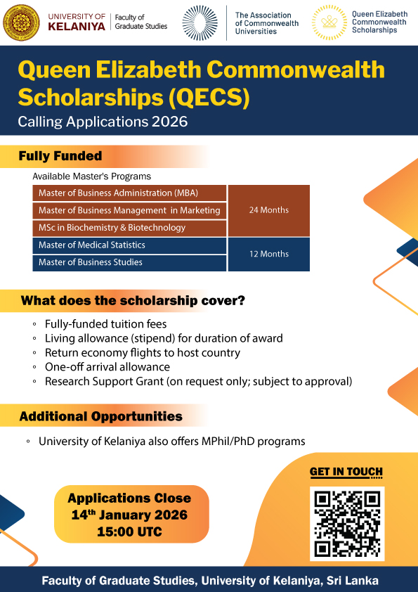 The University of Kelaniya is inviting applications for the fully funded Queen Elizabeth Commonwealth Scholarships for various Master’s programmes commencing in 2026.