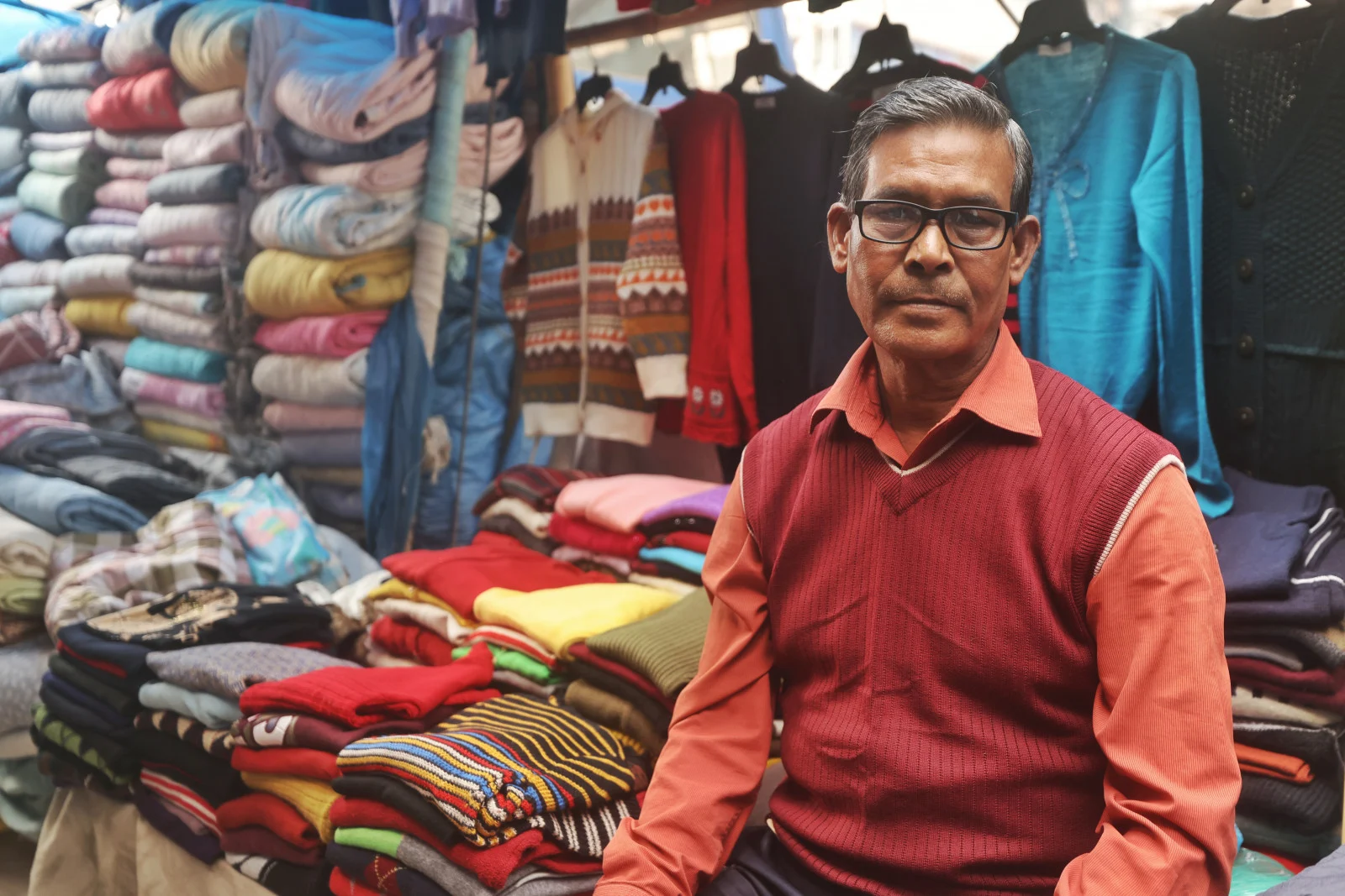 Tulsideb Saha, who has been in the second-hand clothes business since 1972, is in front of his shop.