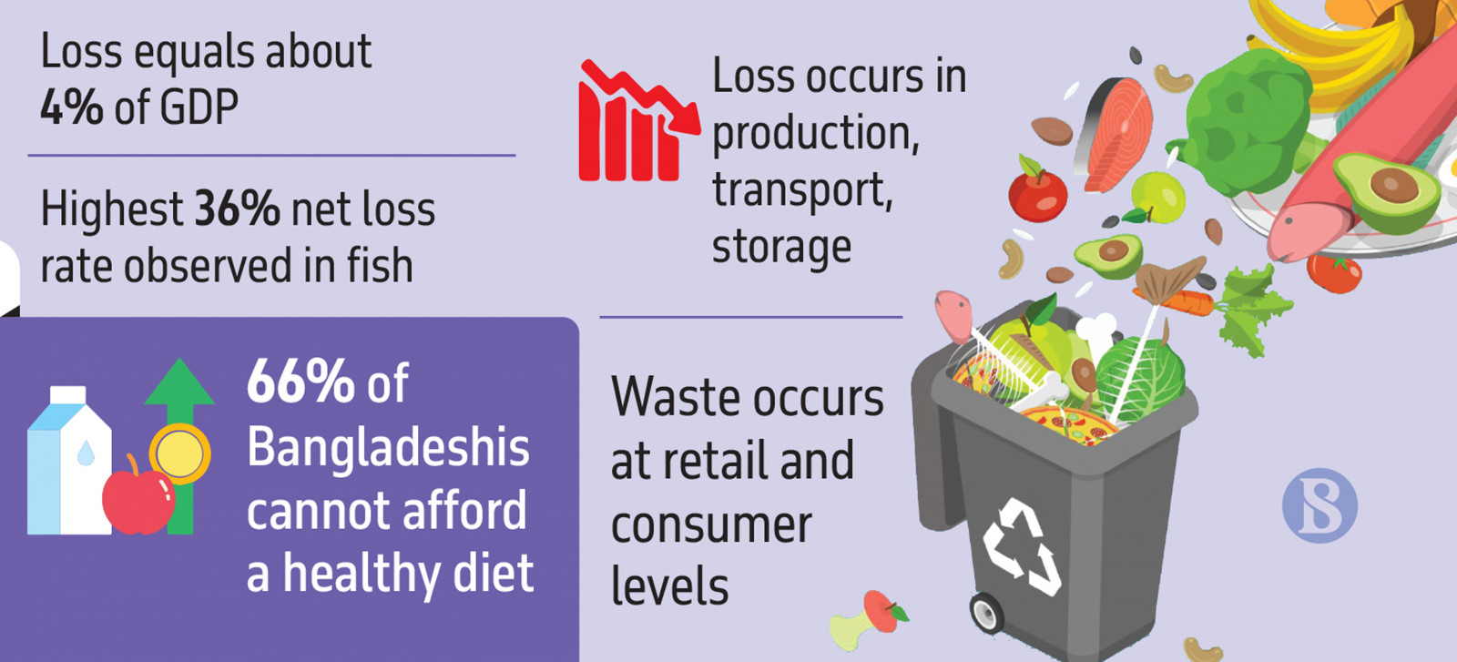 At the same time, 31% of Bangladeshis face food insecurity, while 66% cannot afford a healthy diet – highlighting the stark paradox of massive waste amid widespread scarcity.