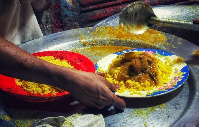 One trademark of Manik Chan’s stall is its affordability: just Tk200 for a hearty meal, with generous portions of polao and large chunks of meat.