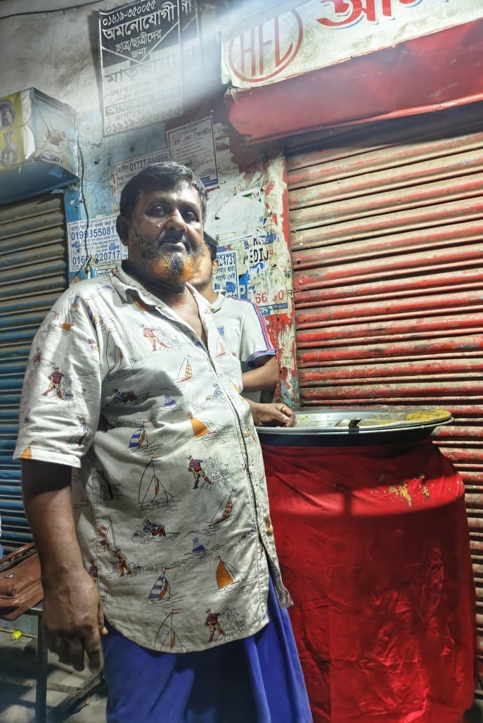 Beside a huge pot, a large ladle in hand, stands Manik Chan himself, wearing a lungi, short in stature, with an unassuming face and a physique that shows his love of food.
